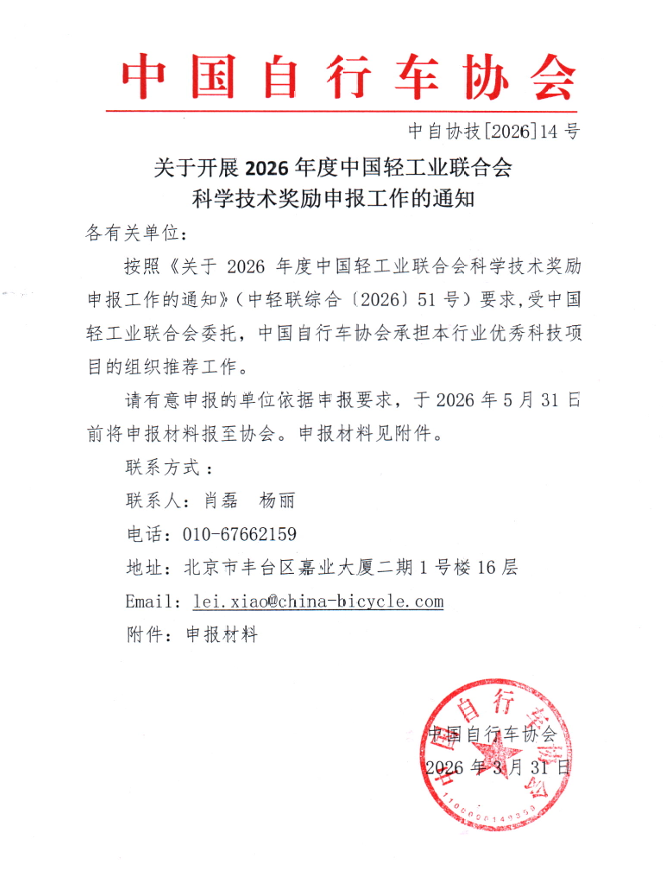 关于开展2026年度中国轻工业联合会科学技术奖励申报工作的通知 来源: 作者: 发布时间:2026-04-02 15:25 附件1. 关于2026年度中国轻工业联合会科学技术奖励申报工作的通知 附件2. 中国轻工业联合会科学技术奖申报书 附件3.组织申报中国轻工业联合会科学技术奖的各轻工行业协会、学会名单 附件4.《中国轻工业联合会科学技术奖申报书》填写说明