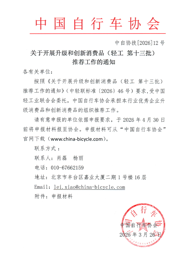 关于开展升级和创新消费品(轻工第十三批)推荐工作的通知 来源: 作者: 发布时间:2026-03-31 10:35 附件1. 申报通知 附件2、《升级和创新消费品(轻工 第十三批)》推荐书(word版) 附件3、推荐升级和创新消费品(轻工 第十三批)汇总表(excel版)
