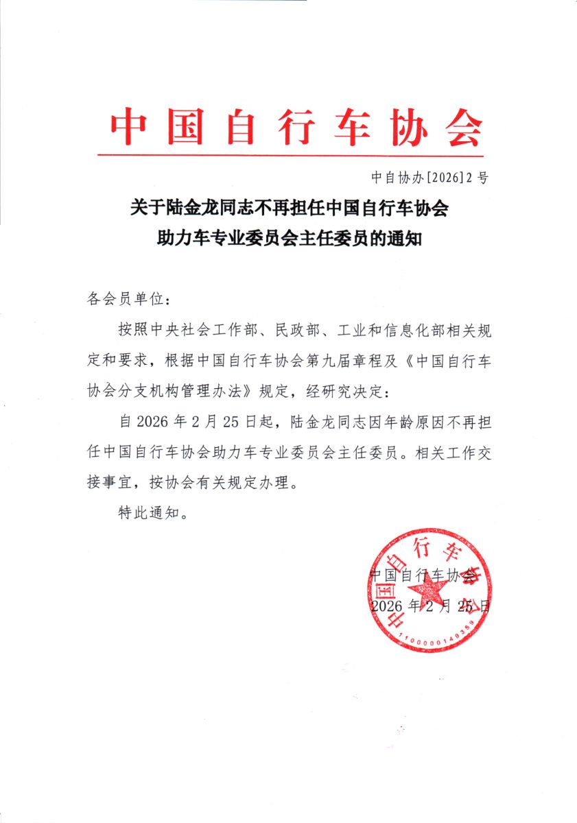 关于陆金龙同志不再担任中国自行车协会助力车专业委员会主任委员的通知